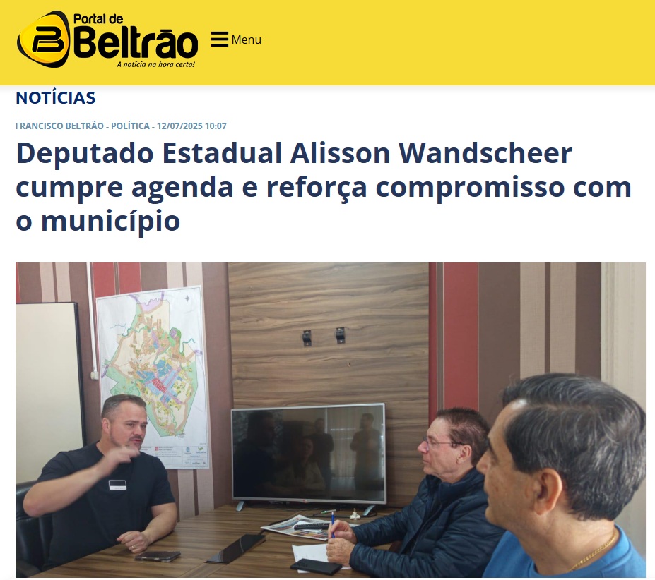 Durante a agenda, Alisson foi recepcionado por importantes nomes da política local, entre eles o empresário Idalino Menegoto e João Marchiori. O deputado também esteve na Prefeitura Municipal, onde foi recebido pelo prefeito Antônio Pedron e o coordenador Eleandro Ribeiro. As conversas giraram em torno de demandas prioritárias da cidade, investimentos e projetos futuros para beneficiar a população beltronense.