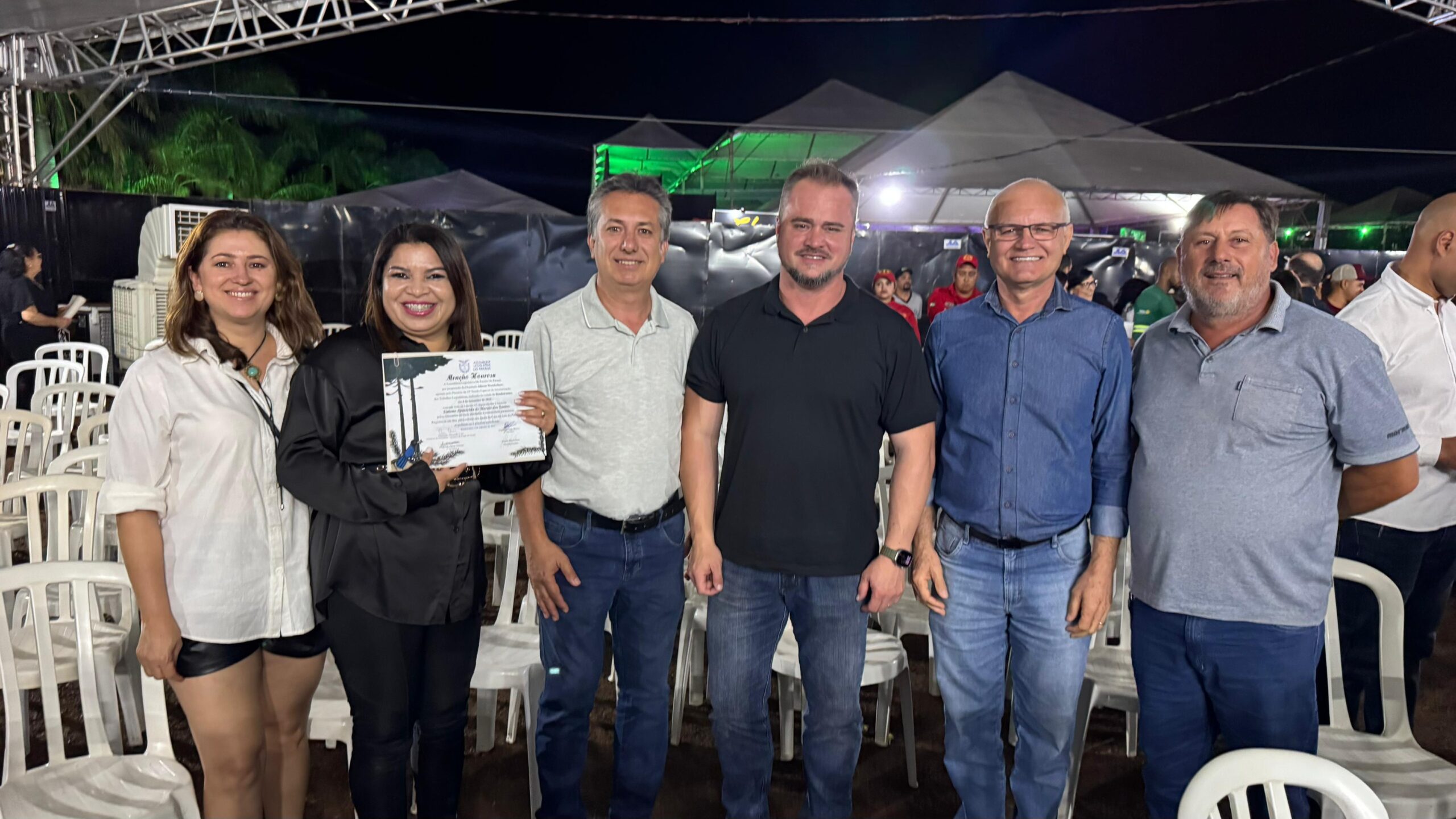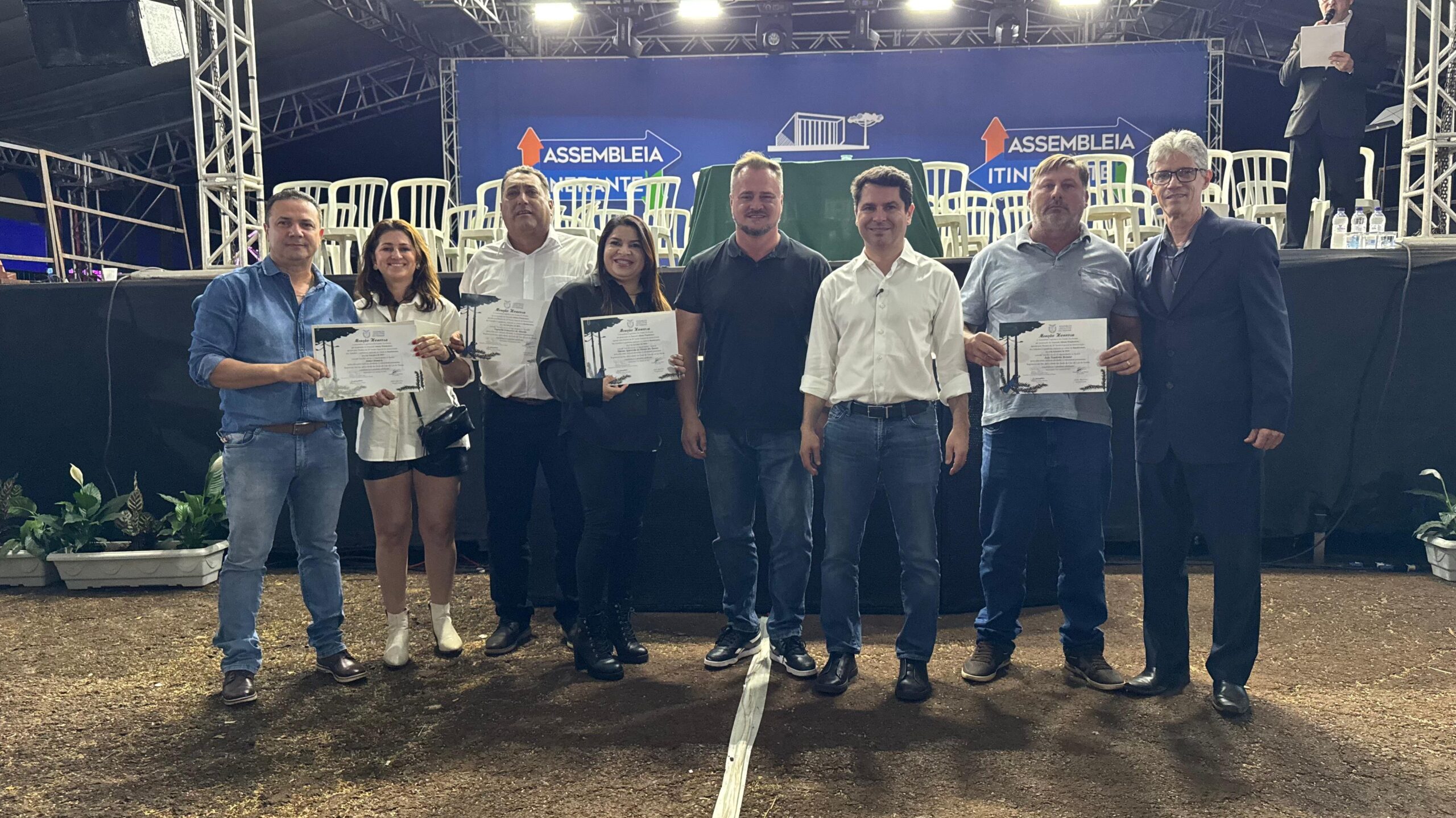 Durante a sessão especial conduzida pelo presidente da Assembleia Legislativa do Paraná, deputado Alexandre Curi, foram entregues menções honrosas a personalidades que se destacam em suas áreas de atuação. Alisson homenageou o vereador Antonio Carlos Demício, o diretor de Aviação e Urbanização, João Vanderlei Bernini; o ex-vereador Sidnei Demício; a secretária municipal de Assistência Social Simone Aparecida de Moraes dos Santos e o vereador Vagnerlei Gonçalves de Almeida. “Este é meu reconhecimento e do legislativo paranaense a pessoas que contribuem com o desenvolvimento das suas cidades e ajudam a construir a história do nosso estado”, afirmou.