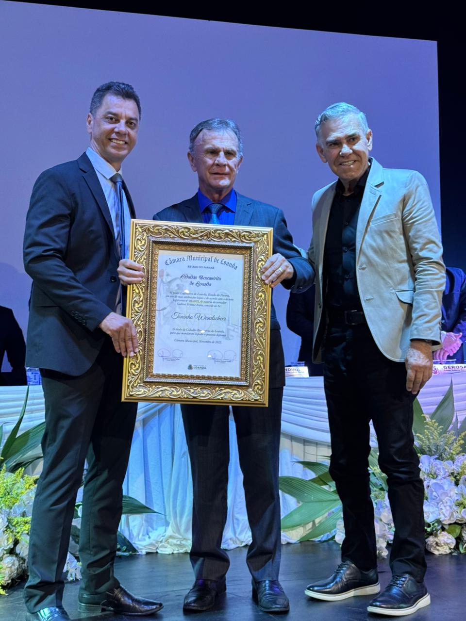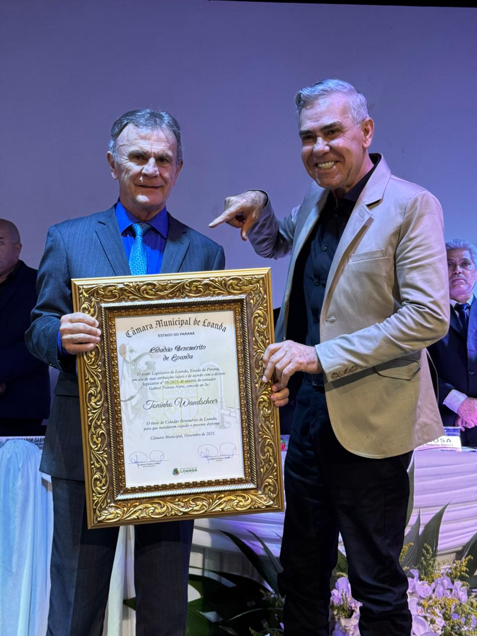O deputado federal Toninho Wandscheer, que já havia sido agraciado com o título de Cidadão Honorário, foi agora distinguido como Cidadão Benemérito de Loanda, por proposição do presidente da Câmara, vereador Gabriel Feitoza Norte (Gabriel Bié). Toninho é responsável pela destinação de R$ 26 milhões em investimentos para o município, consolidando uma parceria de resultados concretos com o prefeito Zé Maria e os vereadores.