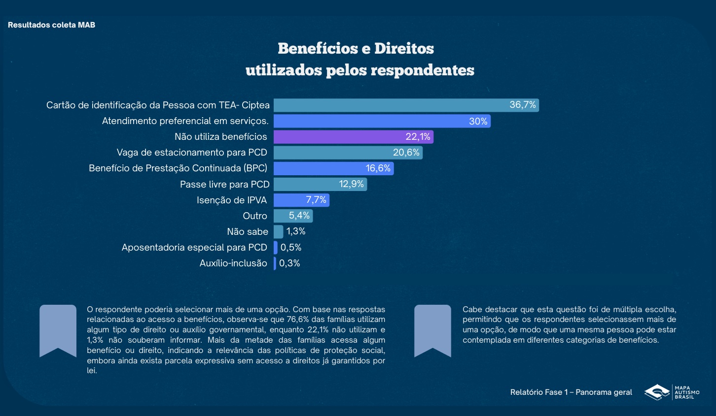 Do total de entrevistados, 76,6% afirmaram utilizar algum tipo de benefício. No entanto, a maior parte é para acesso e identificação: 36,7% usam o cartão de identificação da pessoa com TEA, 30% usam atendimento preferencial em serviços e 20,7% usam vaga de estacionamento para pessoas com deficiência.