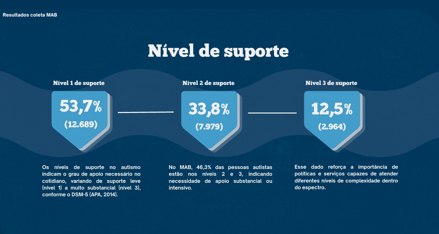 - 53,7% têm nível 1 de suporte (o mais baixo); 33,7%, nível 2 de suporte; e 12,6%, nível 3 de suporte (o que requer maior auxílio no dia a dia);