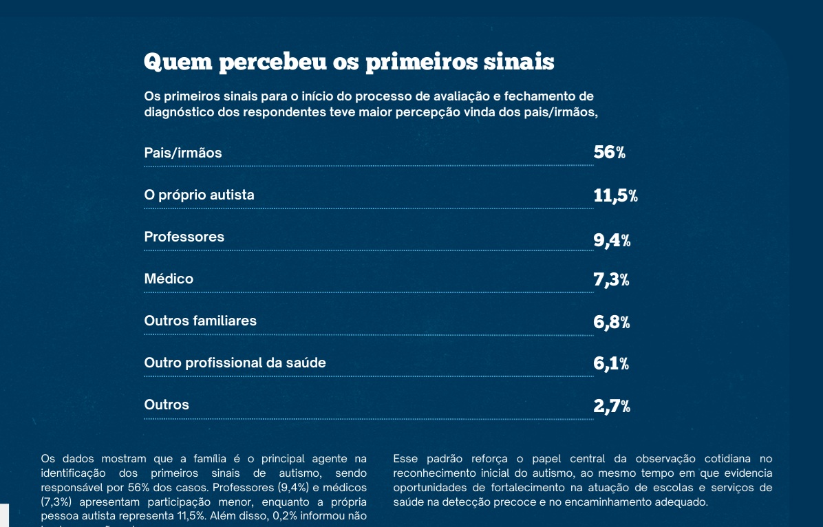 A pesquisa identificou também que os primeiros sinais de TEA são percebidos majoritariamente por familiares próximos (55,9%) ou pela própria pessoa autista (11,4%), enquanto médicos e professores alertaram sobre os primeiros sinais apenas em 7,3% e 9,4% dos casos, respectivamente.