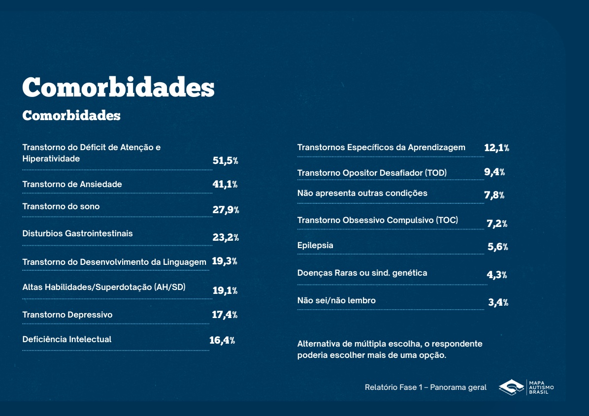 - Como comorbidades, 51,5% têm transtorno do déficit de atenção com hiperatividade (TDAH); 41,1%, transtorno de ansiedade; 27,9%, transtornos do sono; 23,2%, distúrbios gastrointestinais; 19,3%, transtorno do desenvolvimento da linguagem; 19,1%, altas habilidades/superdotação; 17,5%, transtorno depressivo; 16,4%, deficiência intelectual; e 12,1%, transtornos específicos da aprendizagem;
