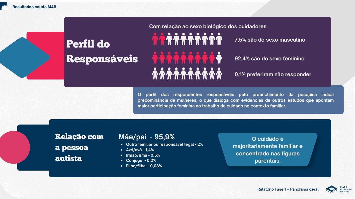 Entre os respondentes responsáveis por pessoas autistas, 96% eram mãe ou pai – desses, 92,4% eram mães.